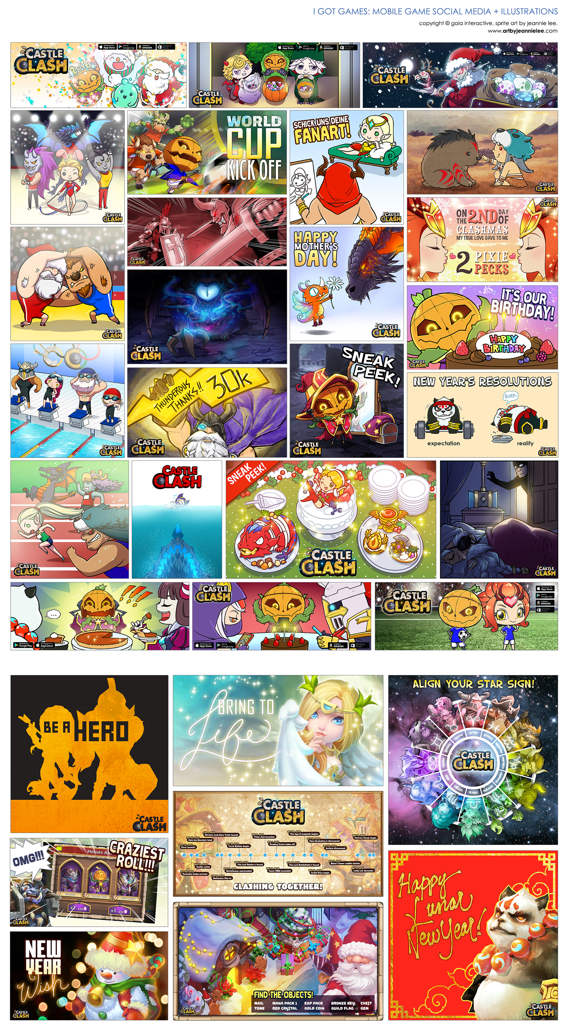 A collection of custom illustrations and social media graphics created for IGG's "Castle Clash" mobile game.