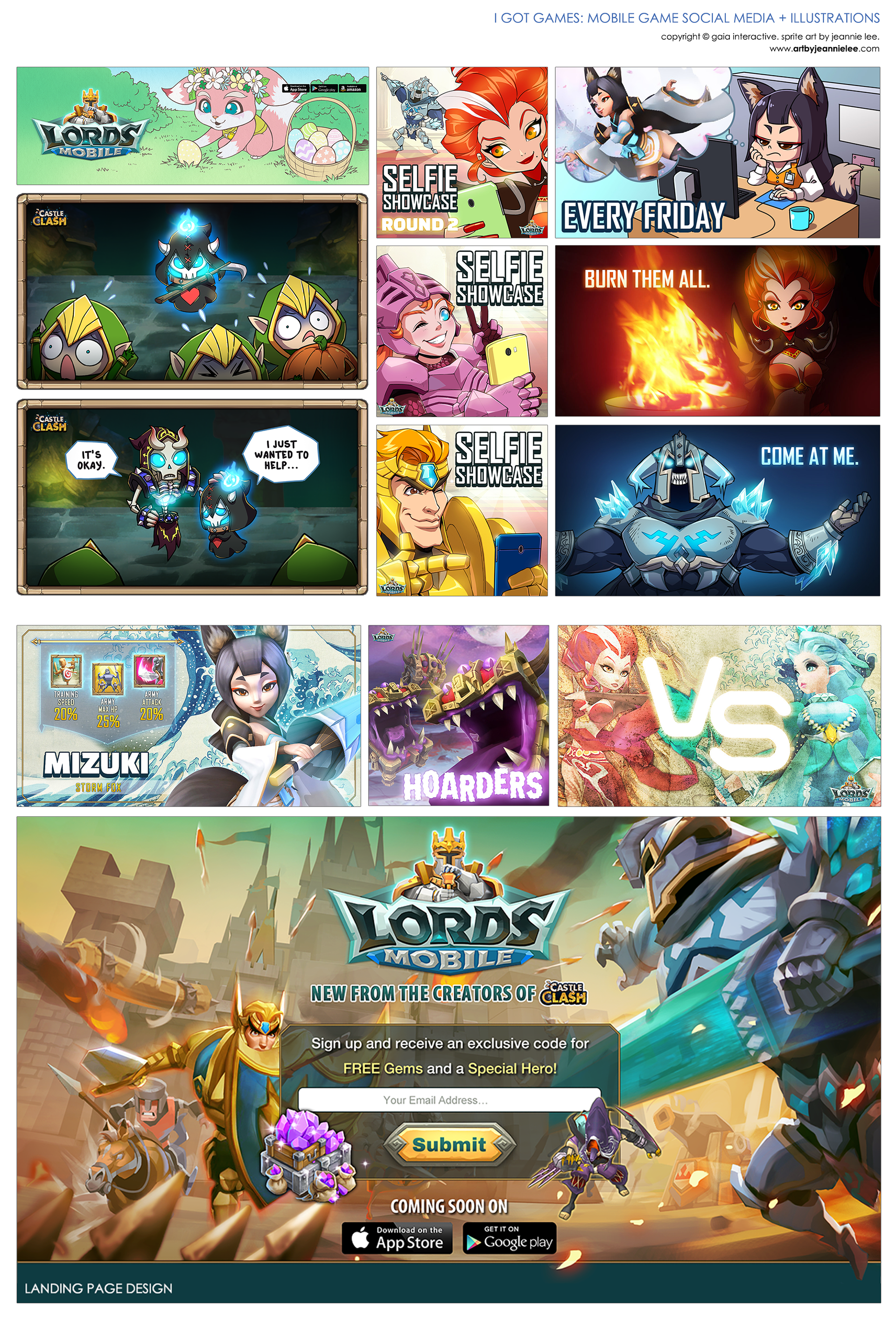 A collection of custom illustrations, social media graphics, and other online concent created for IGG's "Lords Mobile" mobile game.